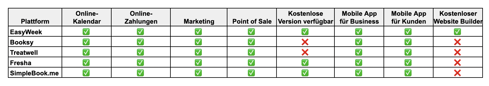 Wir haben fünf der beliebtesten Online-Terminbuchungsplattformen 2025 miteinander verglichen. In der folgenden Tabelle können Sie sehen, welche Funktionen jede Plattform bietet und wie sie sich hinsichtlich der wichtigsten Kriterien unterscheiden.